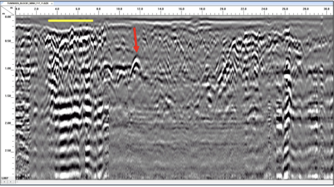 GPR Signal Output:GPR signal output. Yellow line shows feature consistent with a buried hard “surface” while the red arrow points to small feature such as a stone or pipe.