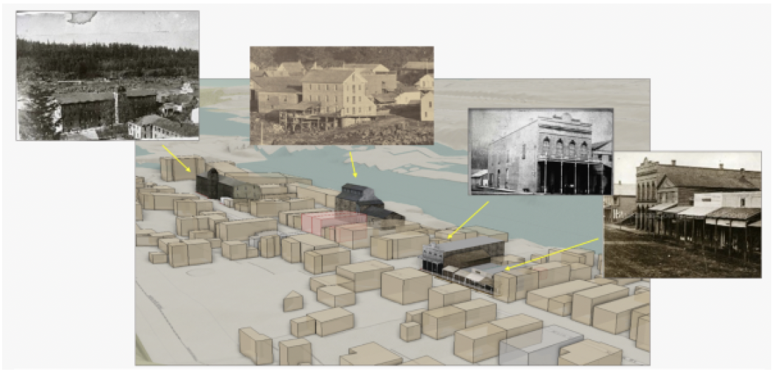 3D Oregon City Models:Using historic photos to create textured 3D models of Oregon City. The block shapes are simple models based on the information obtained from georeferenced Sandborn insurance maps that indicate height and construction materials; brick (red) and wood (tan). The textured models were drawn in 3D polygon shapes for some of the more prominent buildings.