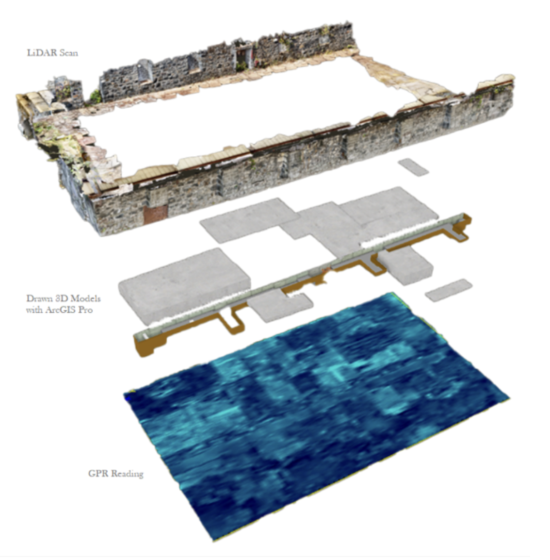 GPR:Ground Penetrating Radar (GPR), uses electromagnetic waves to detect reflection of the signal off of subsurface features, further enriches data, and archaeological reconstructions.